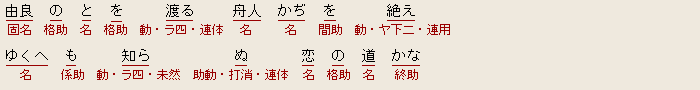 由良のとを ― 「由良」は、作者が丹後掾であったことから、丹後国(京都府)の由良川と思われるが、日本各地に由良という地名があり、それらも歌枕として用いられた例があるため、定かではない。この歌の場合、「由良」は、特定の場所であることは重要ではなく、かぢがなくなった舟が“ゆらめく”さまを表現するたに用いられている。「と」は、水の流れが速くなる場所。瀬戸。「を」は、経由点を表す格助詞。